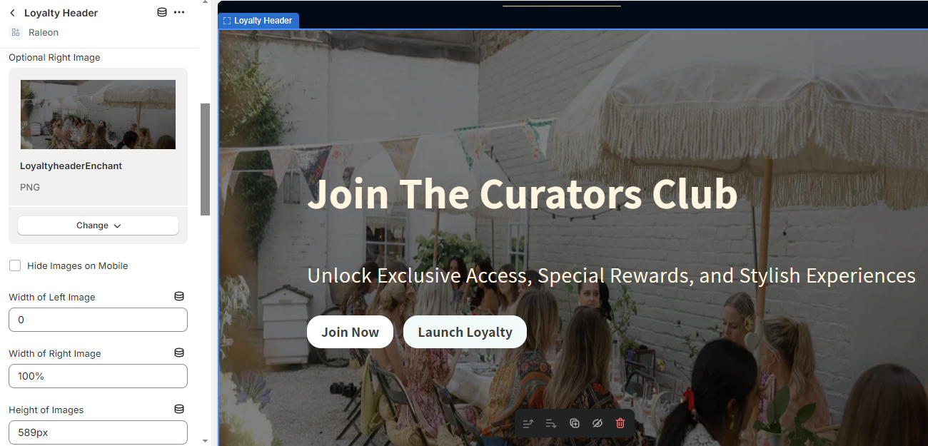 - The loyalty header will have two buttons by default: Join Now and Launch Loyalty.