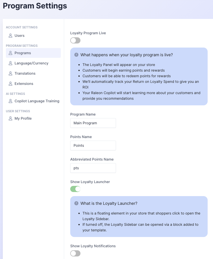 - Show Loyalty Launcher - If you've elected to use Raleon's Loyalty Launcher to drive customer engagement with your program, you can turn that on here. If this is toggled off, the Loyalty Launcher will not show on your site.