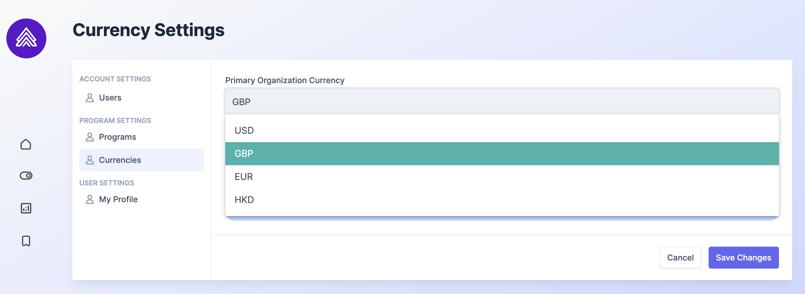 - Application-wide Update: Changing the currency setting will update the display of currencies throughout the app, including analytics, reporting, and metrics.
